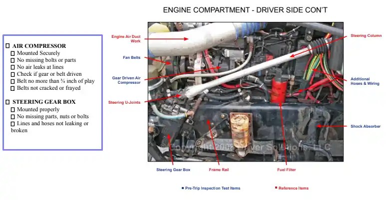 This diagram was taken directly from the cdl handbook. As you go through the process remember to clean lights and reflectors as needed. Check for leaks under engine and . This includes an under the hood engine compartment inspection. The test requires you to only inspect the driver side unless the item is only on the passenger side (parts in engine compartment, exhaust).